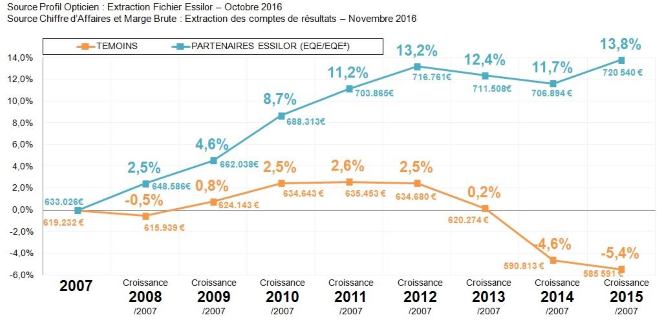 En cumulé, sur la période 2007-2015, l’écart observé est de 19,3 points (+13,8% pour l’échantillon « partenaires Essilor » et -5,4% pour le groupe témoin) représentant un différentiel total de chiffre d’affaires additionnel de 121 155 € en faveur des opticiens partenaires d’Essilor France. En termes de marge brute, l’écart d’évolution entre les 2 groupes de magasins est porté sur la période 2007-2015 à +16,1 points (+11,5% pour les opticiens partenaires d’Essilor France vs. -4,6%).