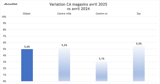 - Les magasins situés en ZAC affichent une forte croissance de +5,5% par rapport à avril 2024.