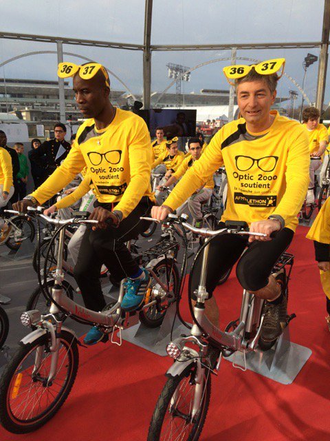 Didier Papaz, PDG du groupe Optic 2000, aux côtés de Trésor Makunda, athlète de haut niveau déficient visuel quadruple médaillé paralympique, lors du défi "vélos statiques" sur le Champs-de-Mars (Paris) pour l'AFM-Téléthon 2015. Twitter @tresormakunda |