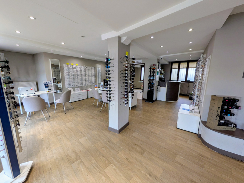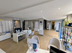 Magasin disposant de grandes vitrines et d'un espace de vente spacieux et lumineux (~100m²) dans lequel deux espaces délimités sont consacrés à l'atelier (~12m²) et aux examens de vue (~14m²). Ces derniers sont équipés de matériel Essilor (frontofocomètre, centreur et meuleuse "Mr Orange" et tête de réfraction automatique APH550).