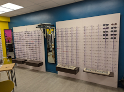 Chaque présentoir contient 75montures . Il y en a 6. + 2 présentoirs avec support lunettes en metal.